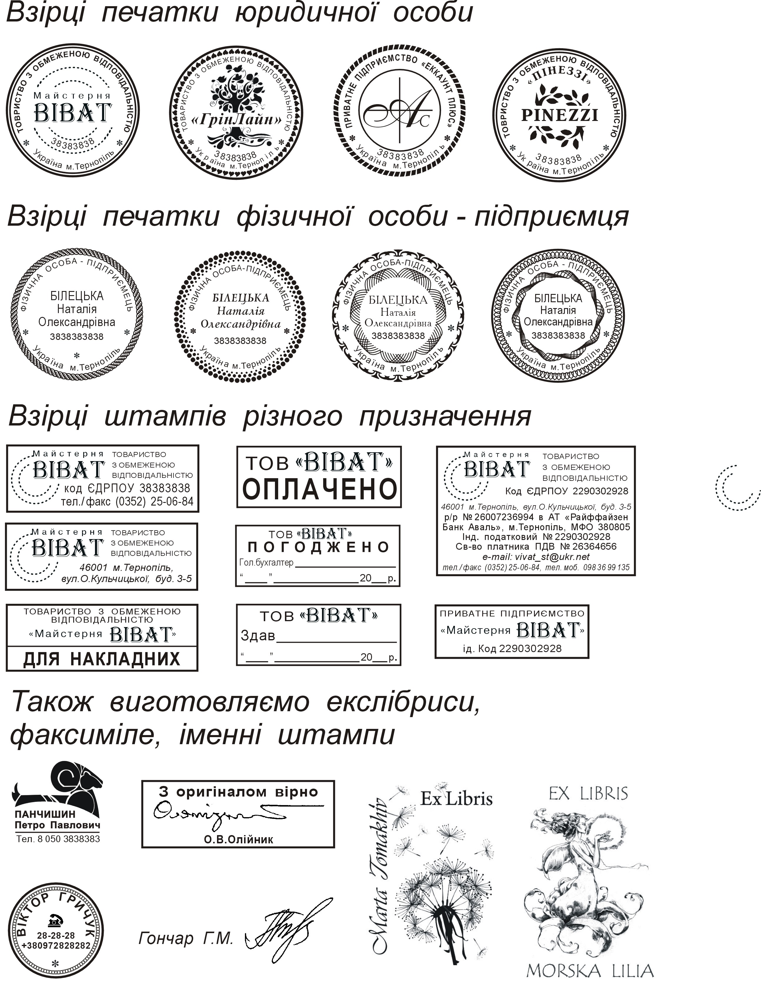 Взірці печаток та штампів 5109 Переглядів Серпень 28, 2012 Немає коментарів Nakaz Взірці печаток та штампів, які виготовляє “Майстерня “ВІВАТ”